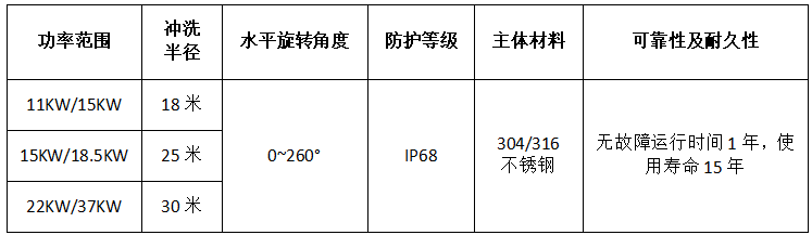 旋轉驅動器及噴射水泵均采用國內外知名品牌,產品本身采用不銹鋼材質的材質和精湛的制造工藝,耐腐蝕,使用壽命長確保裝置在惡劣工作環境下長期穩定運行,減少維修和更換成本。,IP68的防護等級,性能好,耐用可靠。